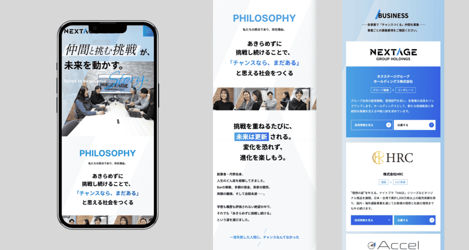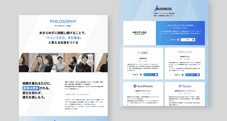企業理念とビジュアルデザインの両面から、ネクステージグループ様のブランドイメージを体現する採用LPに仕上げました。